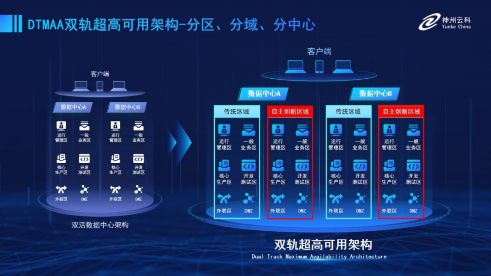 为帮助金融客户更好地应对数字经济时代对可持续性的高要求,实现“信创”与“数字化”齐头并进,EVO视讯官网推出了双轨超高可用架构。该架构在双活数据中心的分区调度基础上,增加信创域和非信创域的分域调度,实行信创域与传统域应用全量部署,使双中心运营变为双中心四区域并行运行,互为多活,将“0到1”的单轨建设道路变为分区分域协同的多活双轨超高可用架构。帮助客户在新架构下,保障“信创”的同时解决性能瓶颈,提升稳定性,保证应用可持续性,最终实现信创区域和非信创区域的平滑过渡,完成国产化替代目标。